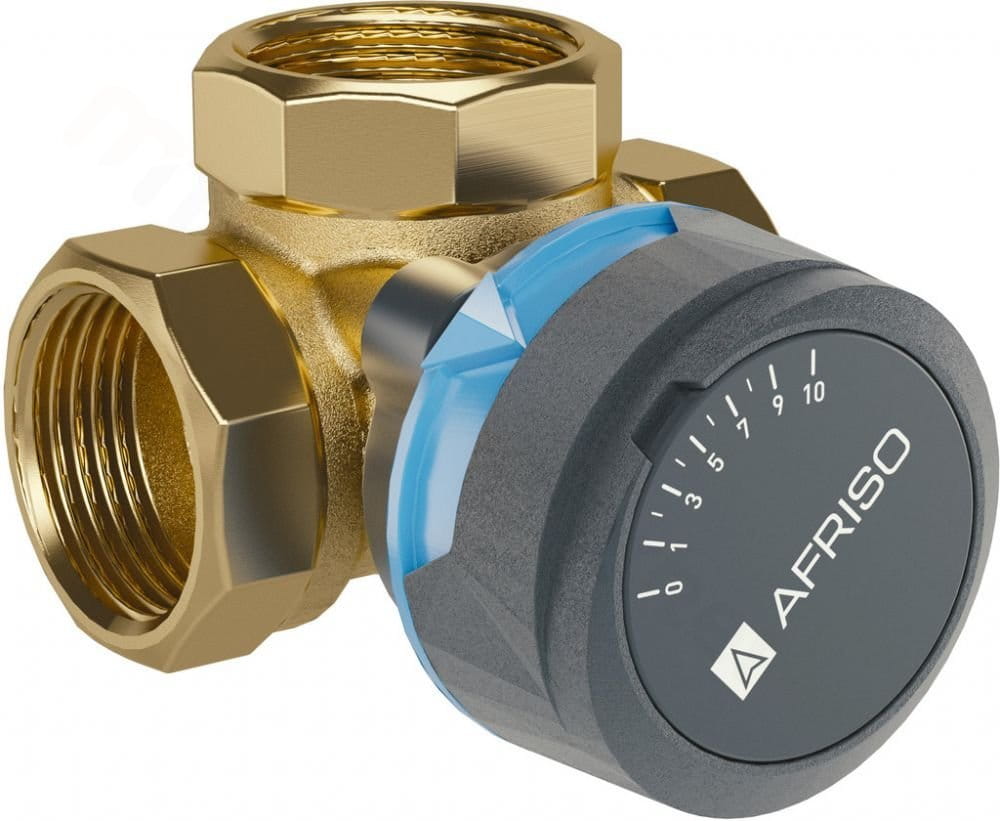 3-drogowy obrotowy zawór mieszający wykonany z mosiądzu. Wyposażony w pokrętło do regulacji ręcznej.