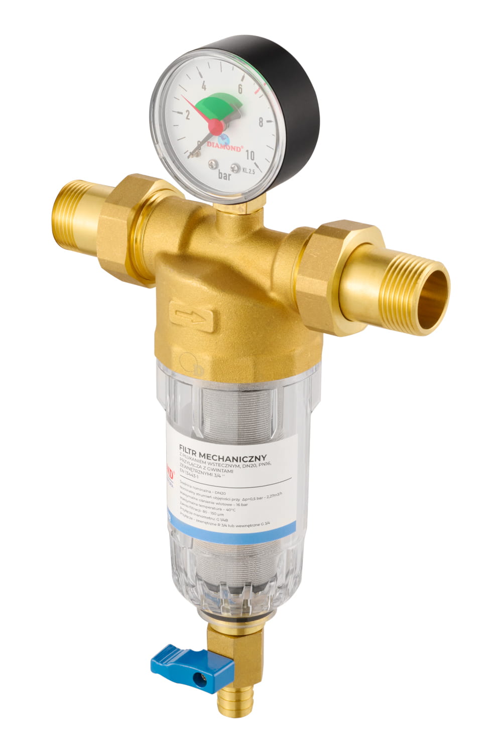 FILTR DO WODY MECHANICZNY SAMOCZYSZCZĄCY Z MANOMETREM 3/4" DN20 Z PŁUKANIEM WSTECZNYM I MANOMETREM SOLIDNY MOCNY DIAMOND ART.350-20