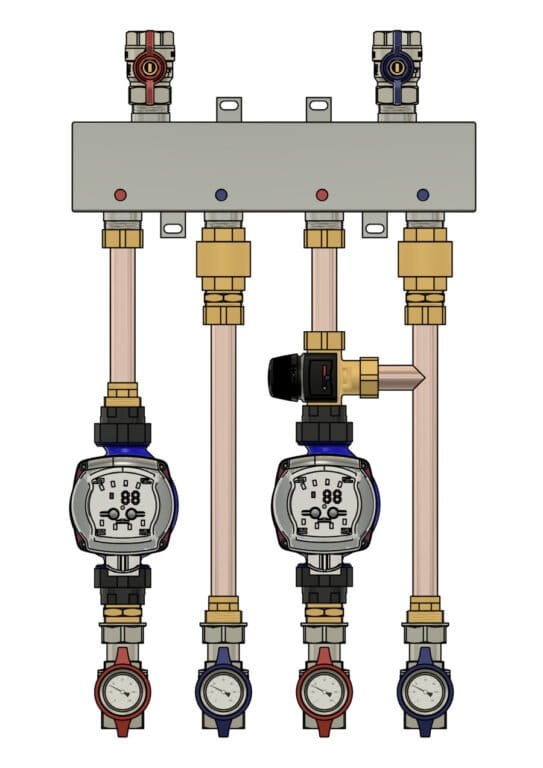 Obiegi grzewcze połączone są dedykowanym sprzęgło-rozdzielaczem.