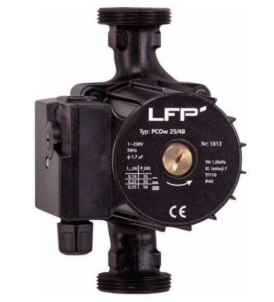 Pompa obiegowa do c.o. i c.w.u PCOw 25/4LFP to uniwersalna pompa przeznaczona do centralnego ogrzewania oraz tłoczenia wody pitnej w układach c.w.u. Trzybiegowa pompa PCOw sprawdza się świetnie w domowych, małych i średnich układach centralnego ogrzewania gdzie temperatura wody waha się pomiędzy 5-110oC. Przedstawiamy nowe pompy które pojawiły się w naszej ofercie – PCOw. Pompy cyrkulacyjne PCOw to typoszereg monoblokowych pomp wirowych z korpusem w układzie liniowym. Do napędu pompy zastosowano specjalny, jednofazowy silnik elektryczny, w którym części wirujące silnika wraz z łożyskami mają bezpośredni kontakt z pompowanym medium. Specjalna tuleja ze stali nierdzewnej oddziela uzwojenia stojana od przestrzeni wypełnionej pompowanym czynnikiem. Dzięki takiemu rozwiązaniu, uzyskano bardzo cicha pracę całego zespołu pompowego. W skrzynce zaciskowej silnika, umieszczony jest przełącznik umożliwiający nastawę żądanej prędkości obrotowej silnika a co za tym idzie zmianę parametrów hydraulicznych pompy.