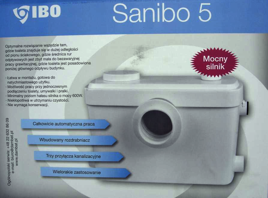 POMPA - ROZDRABNIACZ SANIBO 5 JEST PRZEZNACZONA DO PRZEPOMPOWYWANIA NIECZYSTOŚCI Z WC JAK I Z PRALEK , ZMYWAREK, PRYSZNICÓW UDOSKONALONA I WYCISZONA W PORÓWNANIU DO POPRZEDNICH WERSJI POMPA WYPOSAŻONA JEST W ROZDRABNIACZ ZE STALI NIERDZEWNEJ DZIĘKI CZEMU PAPIER TOALETOWY I FEKALIA MOGĄ BYĆ TŁOCZONE RURAMI O MAŁYM PRZEKROJU.