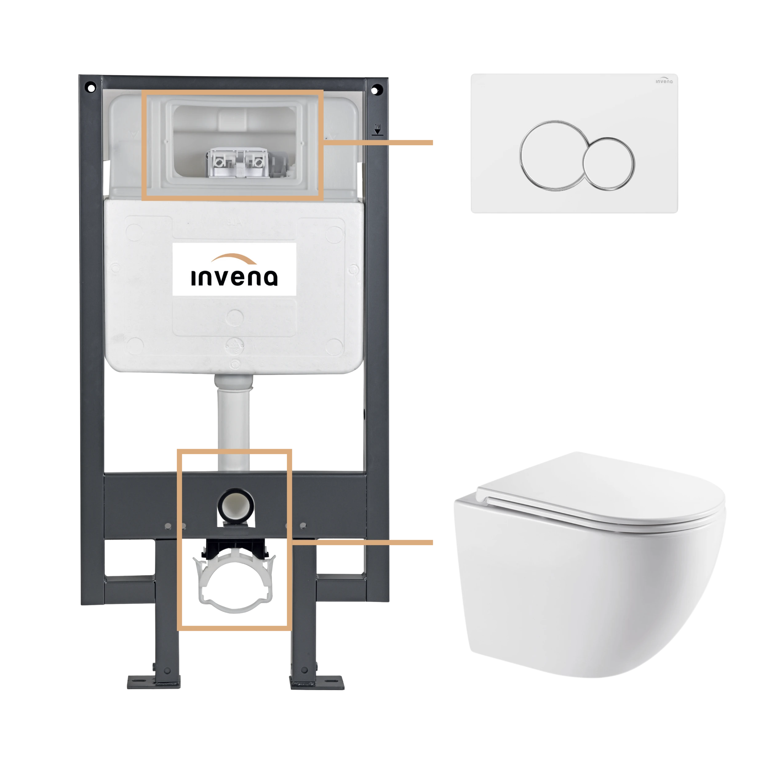 Stelaż podtynkowy o nośności do 400 kg posiada regulowane nogi, rozstaw śrub montażowych 180/230 mm i jednoczęściowy zbiornik z gwarancją szczelności. Dzięki kompletnemu zestawowi przyłączy montaż jest szybki i prosty. Biały przycisk 601 subtelnie uzupełnia całość, podkreślając czystość i świeżość aranżacji łazienki.
