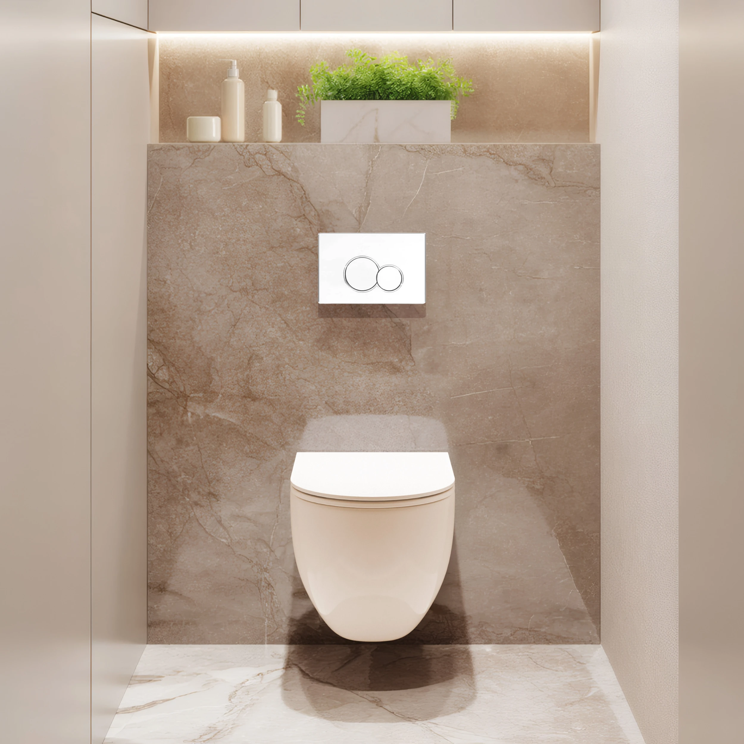 Zestaw podtynkowy WC Astri łączy funkcjonalność i estetykę w minimalistycznym wydaniu. Okrągła miska wisząca z wolnoopadającą deską slim hard i systemem łatwego wypinania to wygoda oraz prostota utrzymania czystości. Technologia cichego spłukiwania QFS i oszczędne spłukiwanie 3/6 l zapewniają komfort i ekologię.