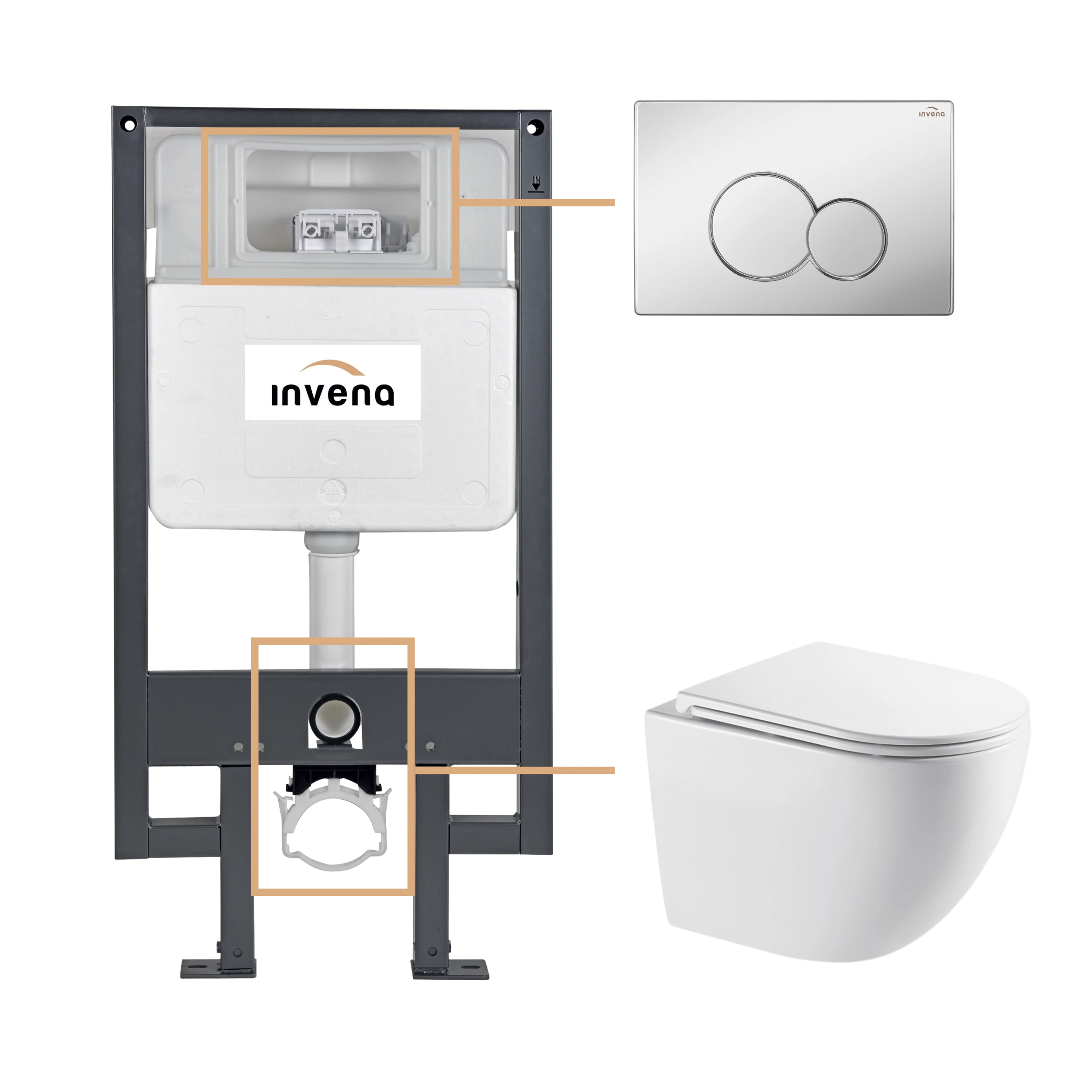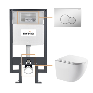 Stelaż podtynkowy o nośności 400 kg został zaprojektowany z myślą o trwałości i łatwości montażu – posiada regulowane nogi (do 20 cm), możliwość zmiany rozstawu śrub montażowych (180/230 mm) oraz łatwo regulowaną obejmę odpływową. Jednoczęściowy zbiornik z cichym zaworem napełniającym i gwarancją szczelności to pewność niezawodności na lata. Chromowany przycisk 601 dodaje zestawowi ponadczasowej elegancji i połysku.